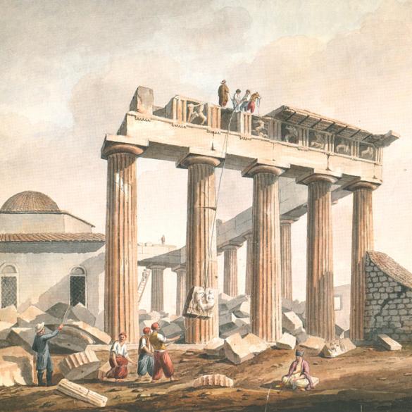 Until the middle of the 17th century, the Acropolis’ most important monuments remained generally intact, as shown by the drawings of European travellers. In 1645, however, the Propylaia suffered severe damage from an explosion of stored gunpowder ignited by a bolt of lightning. Furthermore, in 1686, the Turks, facing a threat from the Venetian army led by General Morosini, dismantled the Temple of Athena Nike to use its building material for reinforcing the Acropolis walls and for construction of a defensive rampart in front of the Propylaia. Then, in 1687, came the Parthenon’s turn. Many of the building’s architectural members were blown into the air and fell in heaps around the Hill of the Acropolis due to the explosion of the gunpowder stored inside the temple. In the 18th century, as more and more travellers visited the Acropolis, they often made a point of taking away something ancient as a memento. Systematic looting of the site, however, occurred at the beginning of the 19th century, when Britain’s ambassador to Constantinople, Thomas Bruce, the 7th Earl of Elgin, managed to secure an authorization (firman) from the Ottoman Sultan for investigation of the Acropolis - but not for stripping the monuments of their sculptural decoration. Nevertheless, Elgin’s team removed a large number of the sculptures until then preserved on the Parthenon, as well as one of the Caryatids from the Erechtheion, four frieze blocks from the Temple of Athena Nike and other antiquities, which were shipped off to Great Britain.