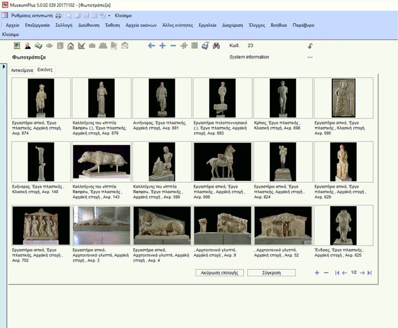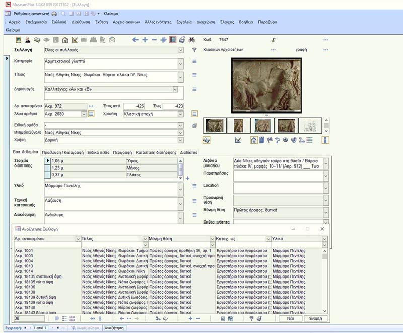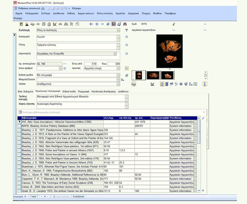 In 2014, the Acropolis Museum acquired MuseumPlus, a specially designed documentation and management system for museum collections. After customizing the software, under the guidance of the Department of Archaeological Collections, who manages the programme, a functional tool has been developed for the complete computer-based documentation of the Museum's collections. To date, all the objects displayed in its galleries have been electronically registered, as well as a large number of those kept in its storerooms. The system, enriched daily with new entries, offers the capability of importing multimedia content and exporting data to the Museum's website, thus providing free public access to scientific and research material.